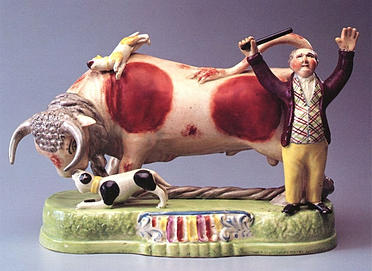 L’histoire de ses ancêtres molosses et dogues remonte aux jeux du cirque sous César, pour traverser le moyen âge avec le Bandog, chien qui montrait des qualités de mordant qui en firent bientôt l’outil des bouchers pour prendre prise sur le mufle d’un taureau sauvage ou rétif, que son maître lui ordonnait de tenir ferme afin qu’il puisse le saigner. C’est ensuite l’escalade et on ne sait si se sont les luttes liées à l’abattage des animaux de boucherie qui engendre l’organisation de spectacles ou l’inverse. Toujours est-il que petit à petit le nom de Bull-dog fut donné aux chiens affrontant les taureaux, ces combats étant nommés eux-mêmes, « Bull Baiting ». Ces spectacles sont tellement prisés que pratiquement chaque ville à un lieu dédié à ces combats, les « Bull-ring ». Toutes les classes sociales Anglaises se passionnent pour ce sport et beaucoup d’argent est alors parié.
